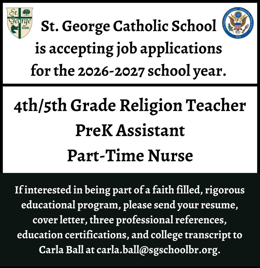 St. George Catholic School is accepting job applications for the 2025-2026 school year. If interested in being part of a faith-filled, rigorous educational program, please send your resume with cover letter and three professional references to Carla Ball at carla.ball@sgschoolbr.org.